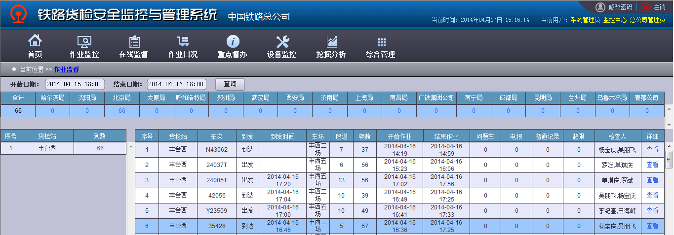 有貨檢作業(yè)的車站,一般成立了貨檢車間。該貨檢車間工作及管理人員使用的《鐵路貨檢安全監(jiān)控與管理系統(tǒng)》是全國鐵路統(tǒng)一開發(fā)和使用的軟件系統(tǒng)。成都貨安計量技術(shù)中心有限公司是該軟件系統(tǒng)的重要開發(fā)參與者和運(yùn)維者。目前該系統(tǒng)已經(jīng)在全路投入使用,并實現(xiàn)了三級聯(lián)網(wǎng),搭接在該系統(tǒng)中實現(xiàn)數(shù)據(jù)交換的有:安全門監(jiān)控系統(tǒng)、軌道衡和超偏載系統(tǒng)、貨檢員現(xiàn)場作業(yè)看車時手持機(jī)系統(tǒng)等。